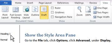 Click OK. Now when you go to Draft or Outline view, you’ll see the style for each paragraph shown in the column to the left of your text.