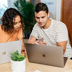 Two co-workers collaborating on a project on a laptop PC.