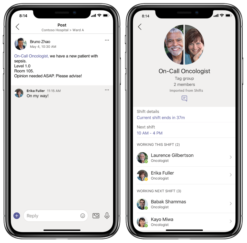Knowing who is on shift and being able to reach them at the right time is key to delivering timely patient care. Often, valuable time is spent trying to identify the correct contact information for healthcare staff members. Currently with targeted communications in Teams, you can manually create tags to organize users based on attributes such as a role, skill, or location. Once applied you can message everyone assigned to a tag at the same time in a chat or channel conversation: for example, you can message all @Orderlies in a ward.