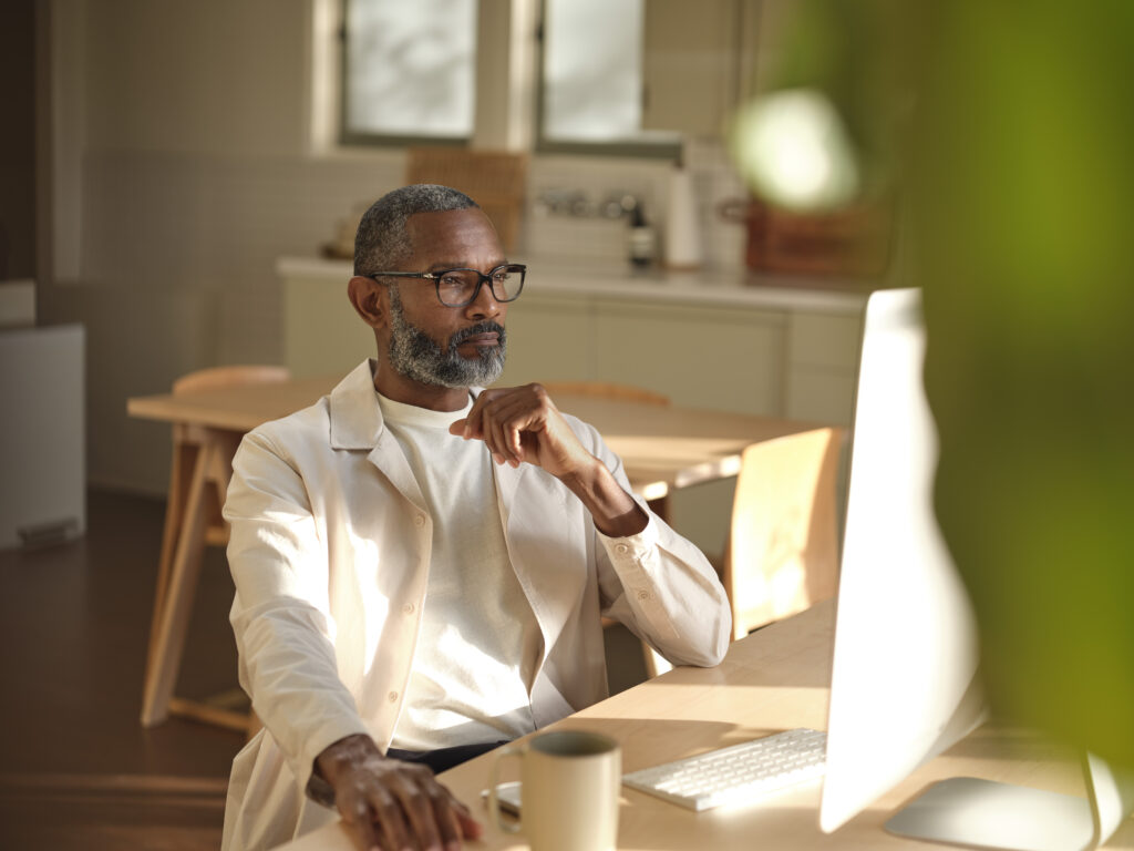 Man sitting at wooden table looking at the the screen on a desktop computer.