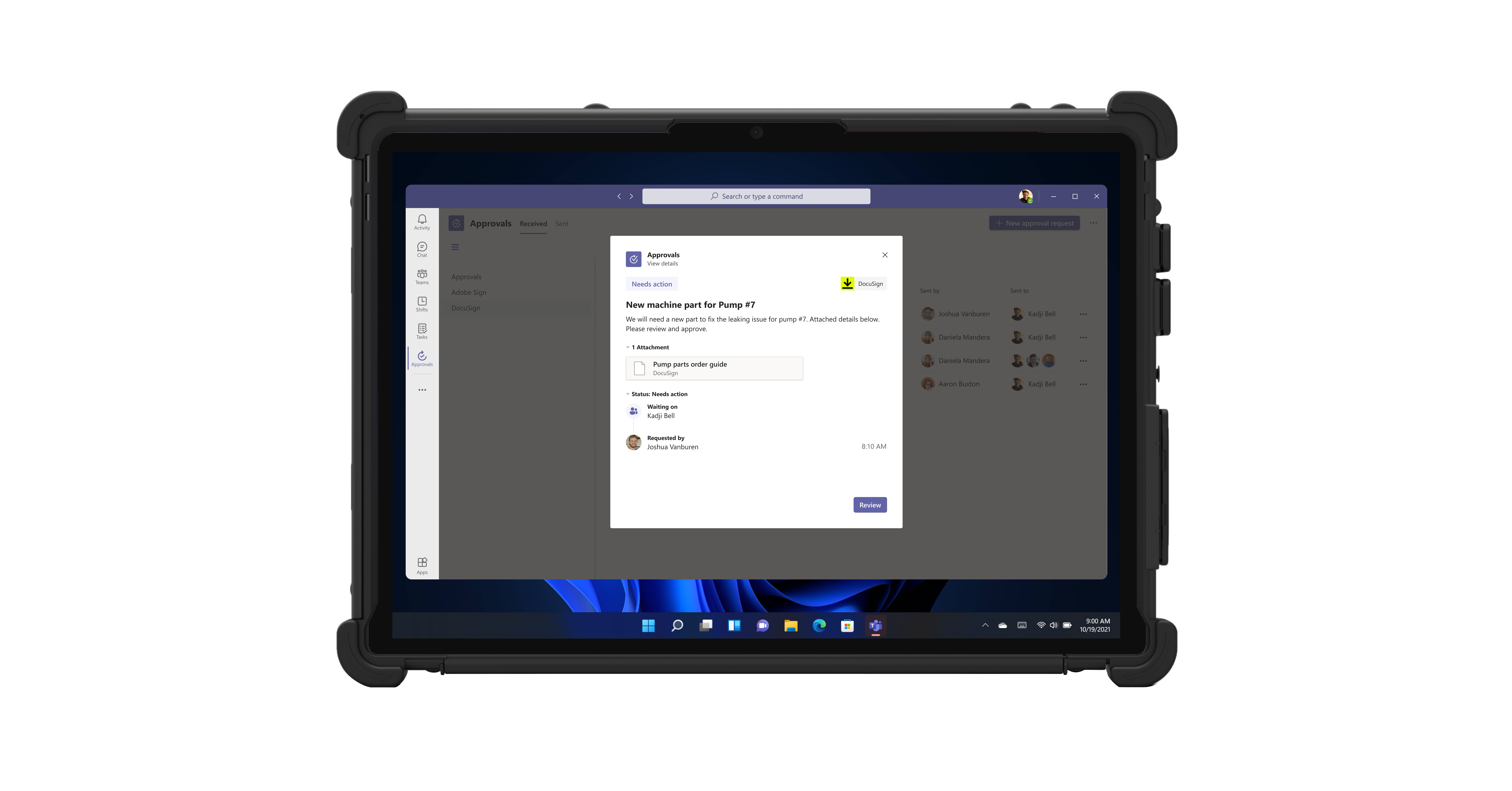 Frontline workers often require the ability to make and receive approval requests—which can mean the difference between whether a machine equipment permit is ready or a shipment leaves on time. To complement our existing Adobe Sign integration, we are announcing the general availability of DocuSign as an Approvals partner coming next month. This partnership extends our electronic signature capabilities already in place in Teams today, allowing your workforce to create and send approval requests right in the flow of work. Integration of the Approvals App with Microsoft Word further streamlines the approval process so workers can create, manage, or request approvals directly from Teams or their Word documents.