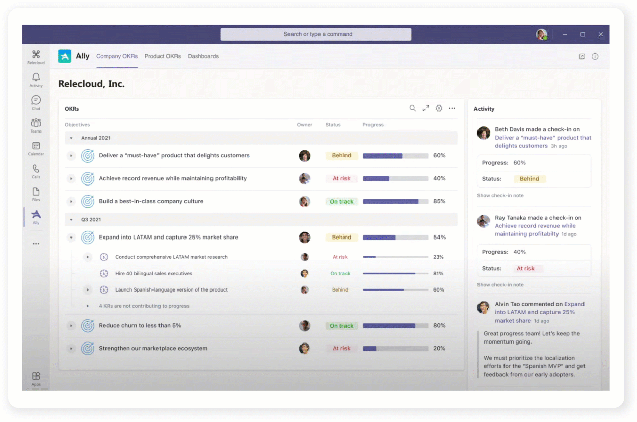 Figure 5. Enhancements to the Ally.io app in Microsoft Teams, as well as an official Microsoft Viva module based on the OKR solution, are on the way.