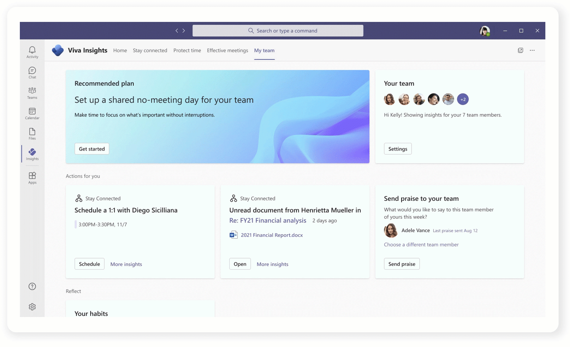 - New manager insights and tools will help managers and team leads stay connected with team members, track outstanding tasks, explore personal habits that impact team culture, recognize accomplishments, and foster team norms such as no-meeting days—all through actionable recommendations. These insights will be available soon for any team size from the My team tab in the Viva Insights app for Microsoft Teams.