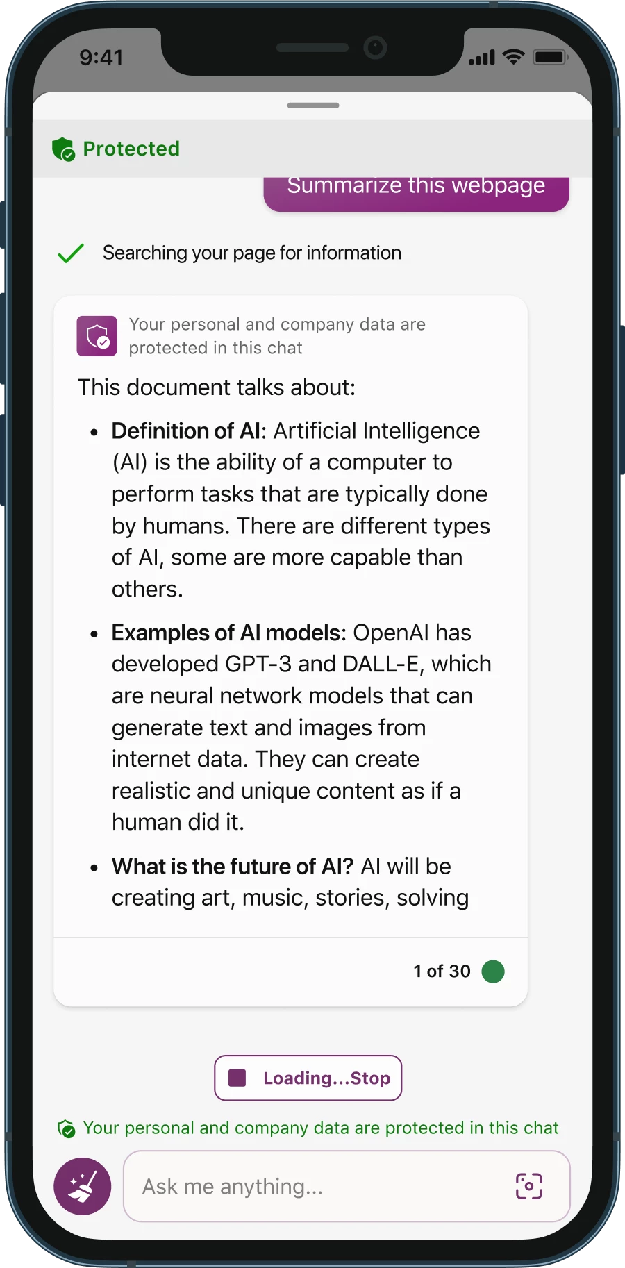 In July, we introduced Bing Chat Enterprise. As organizations adopt AI, they want to be confident that their data is protected. Bing Chat Enterprise adds commercial data protection, ensuring that sensitive business data is never seen by anyone, that the queries are never stored, and user input is never used to train the foundation models.