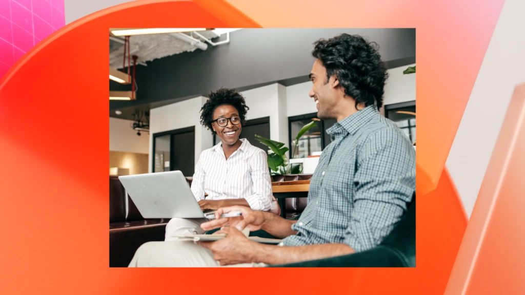 Two people smiling at each other, working together in an office, with an orange and pink graphic background