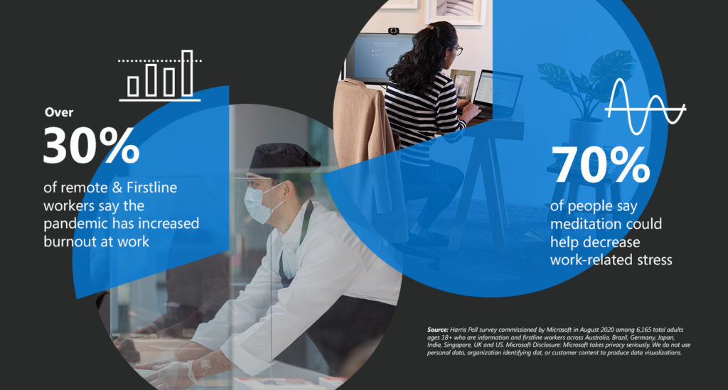 Inspired by this research and conversations with customers, today at our annual Ignite conference we’re marking the start of a longer journey to evolve our productivity tools to promote individual wellbeing and organizational resilience. We’re kicking off today with a virtual commute in Microsoft Teams that will help you prepare for the day and mindfully disconnect in the evening. We’re also partnering with Headspace to bring a curated set of mindfulness and meditation experiences into Teams. To empower managers and leaders who shape company culture, new insights in Teams will offer windows into how work happens, and the impact on employee wellbeing. And finally, new Teams experiences for Firstline Workers will empower people with the tools they need to do their work, more safely.