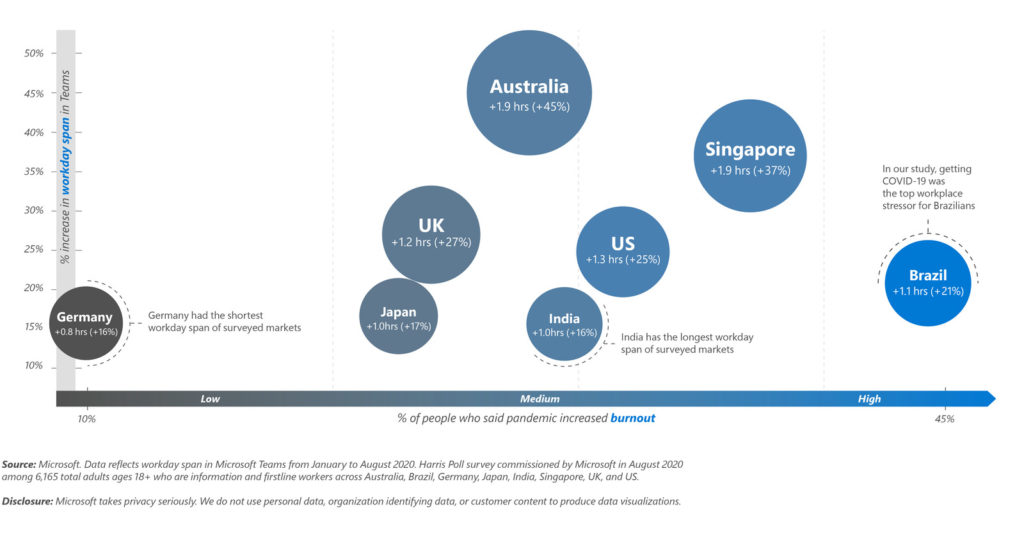 If you’ve been feeling overwhelmed at work lately, you are not alone. Over 30% of Firstline and information workers in our study said the pandemic has increased their feelings of burnout at work. If there’s one thing our research has shown us, it’s that everyone is experiencing this time differently—we’re all in the same storm, but are weathering it in different boats. For instance, 44% of those in Brazil are feeling more burned out compared to 31% in the US and 10% in Germany. While burnout can be attributed to many factors, the chart below explores how longer workdays impact feelings of burnout. For example, workers in Australia saw the highest increase in workday span in Microsoft Teams1 (45%), with a medium increase in burnout. While workers in Germany saw very little change to workday span or feelings of burnout.