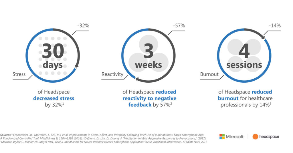 Of those we surveyed, 7 in 10 people (70%) said meditation could help decrease their work-related stress. This number increased to 83% for those managing childcare or homeschooling. Research backs this up – consistent meditation with Headspace can decrease stress and burnout and improve your ability to react to negative feedback. This is why, in addition to bringing curated meditation and mindfulness experiences with Headspace into our virtual commute experience in Teams, we will offer the ability to schedule ad hoc or recurring time for mindfulness breaks anytime—before a big meeting, say, or when you need to focus on an important project.